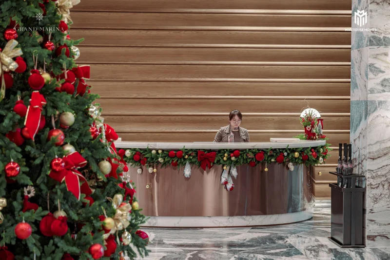 Khu vực sảnh thang máy và các hành lang chung cũng được điểm xuyết bằng những chùm lá thông xanh mướt, đan xen quả châu đỏ và vàng đồng, mang lại không khí ấm áp và thân mật. Những chi tiết trang trí này không chỉ đẹp mắt mà còn thể hiện sự đồng bộ trong thiết kế tổng thể của dự án.